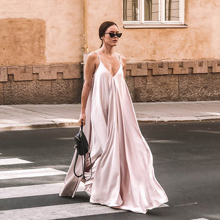 Бяла ефирна рокля, изработена от полу-прозрачна материя с блестящи сребърни нишки, перфектна за плажни визии. Съчетание от нежно гръцко деколте, дълбок изрязан гръб и презрамки тип спагети, вързани на Х, които регулират талията и дълбочината на деколтето. Роклята се съчетава идеално с бански, а цепката придава допълнителна женственост и ефирност на силуета.
