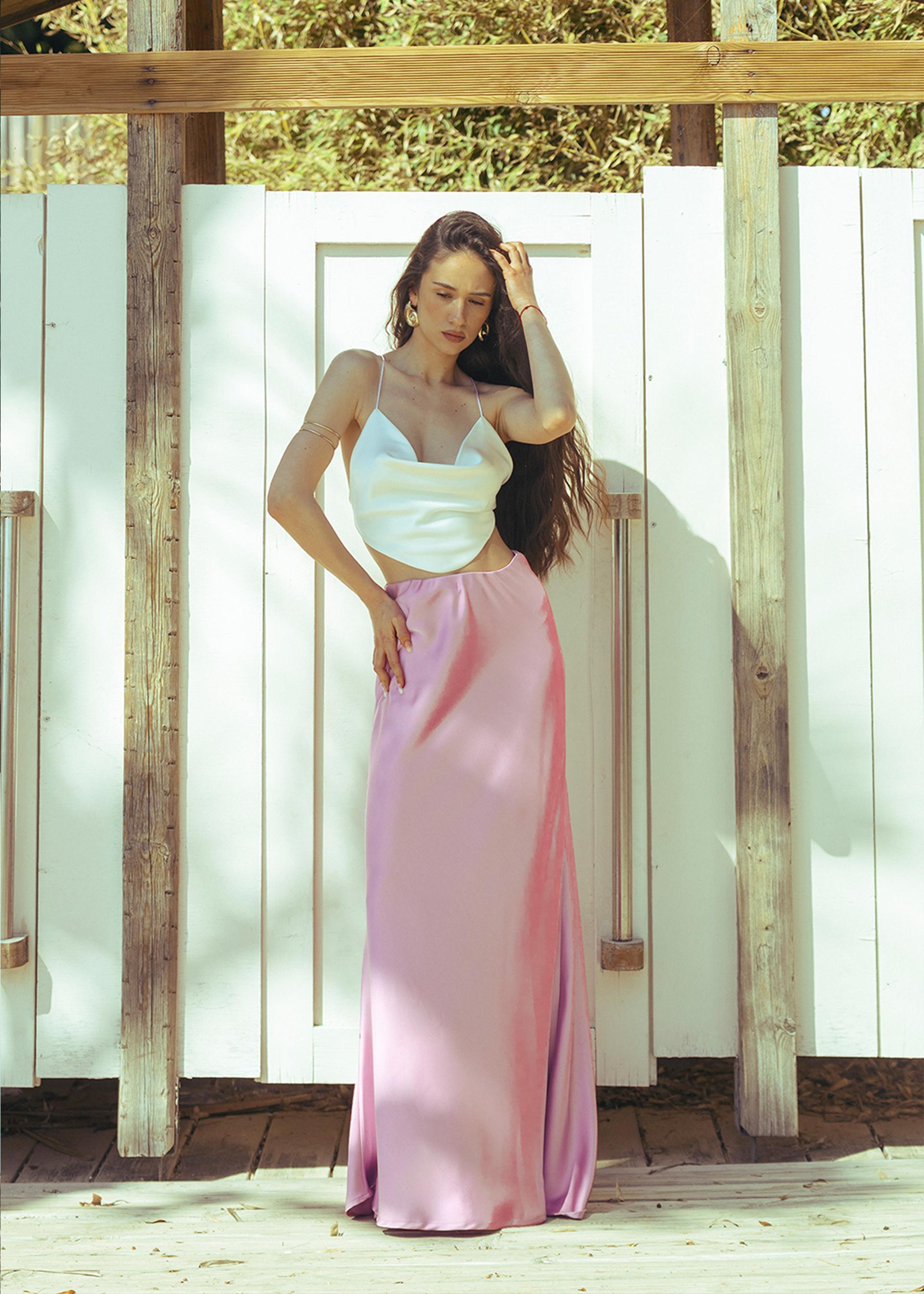 Сатенен топ с гръцко деколте и гол гръб. Нежни презрамки, благодарение на които може да се регулира. Връзките са тип “спагети” с метално накрайниче.