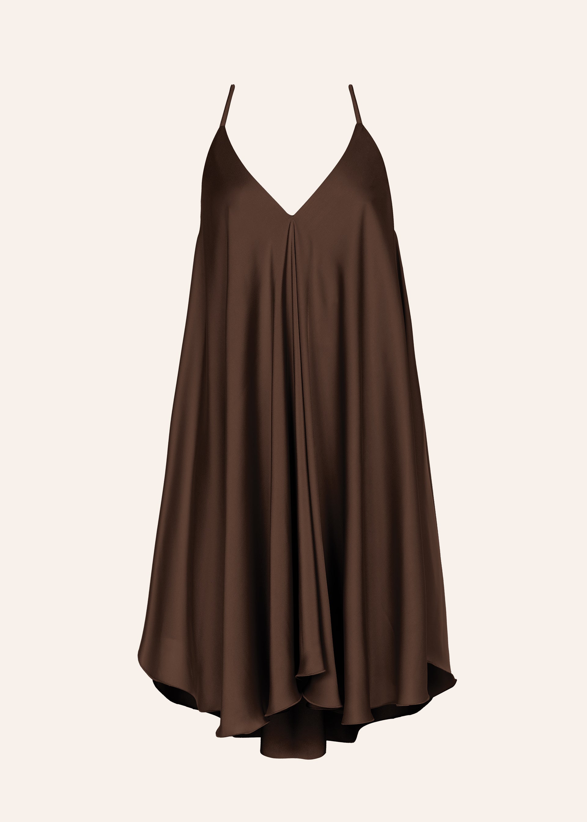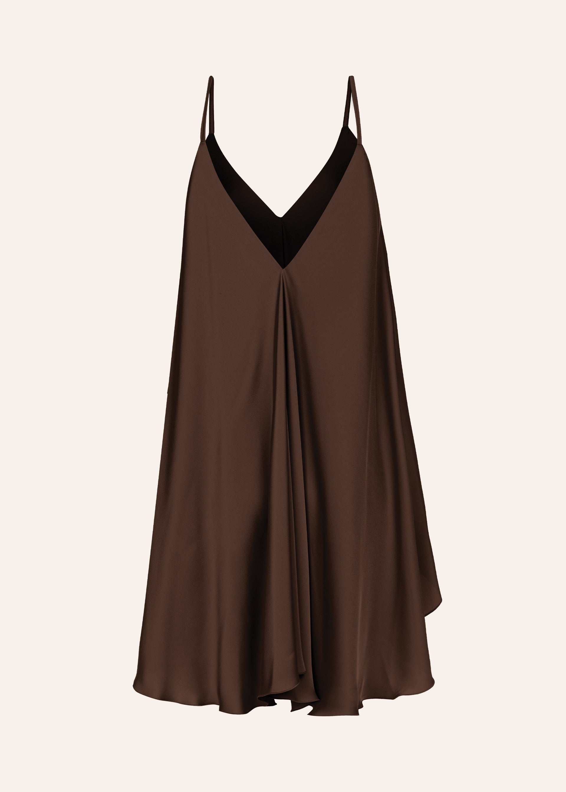Ефирна сатенена рокля със силно разкроен силует. Изключително богата и женствена кройка с V-образно деколте в предната част и в гърба. Тънки презрамки изработени фино от основния плат на роклята. С подплата.